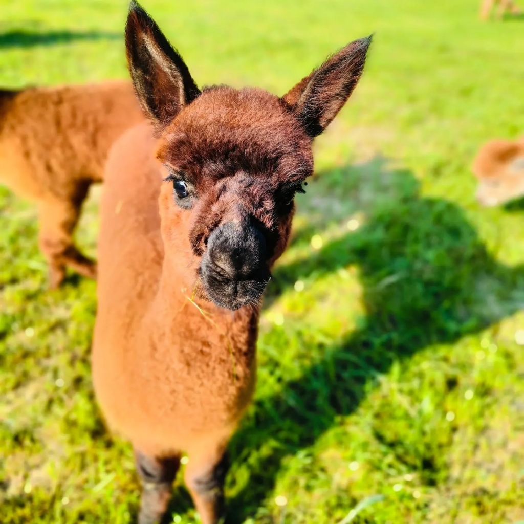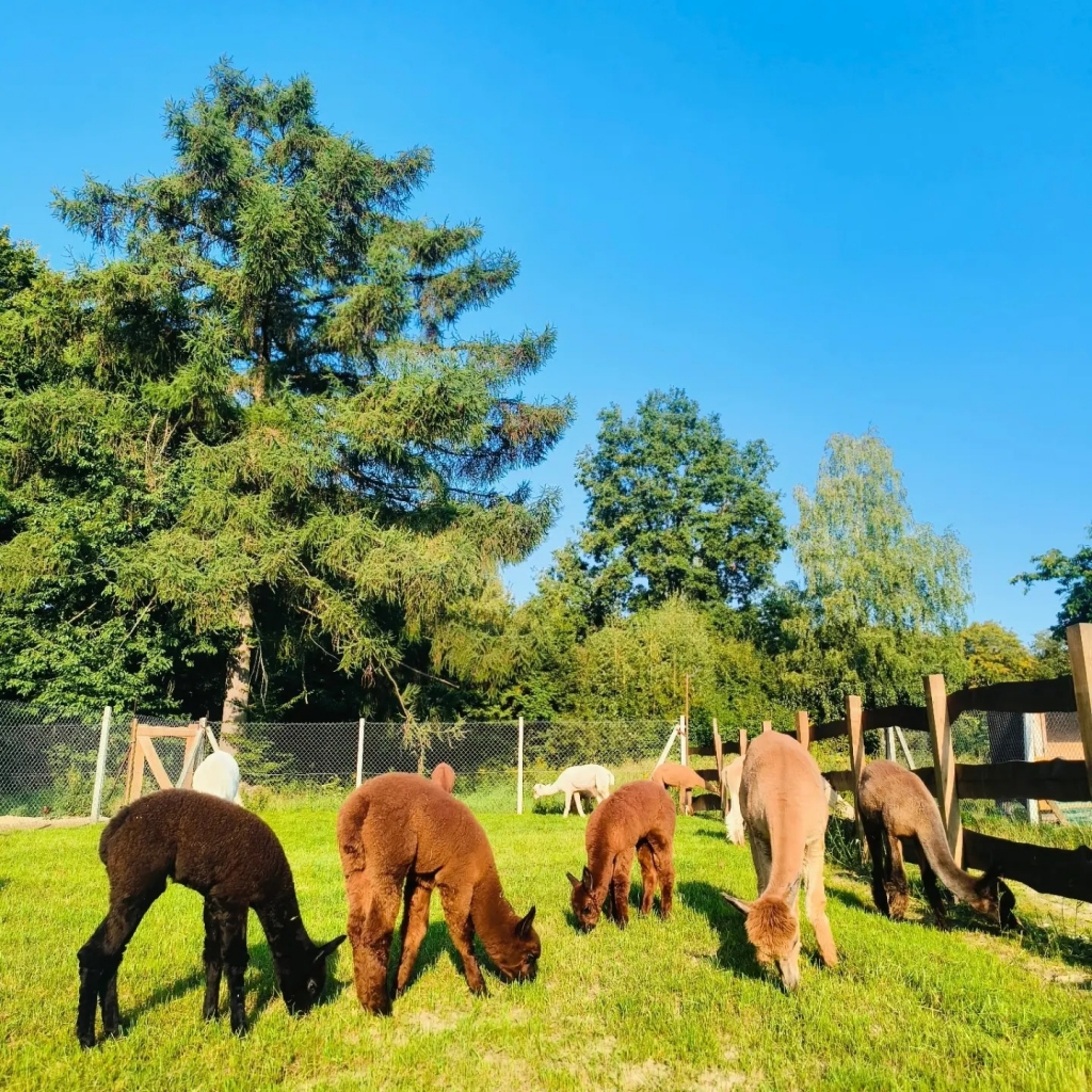 Alpaki, z ich nieco komicznym, a jednocześnie niezwykle eleganckim wyglądem, spacerują spokojnie po zielonych wybiegach, skubiąc trawę i z ciekawością obserwując otoczenie.